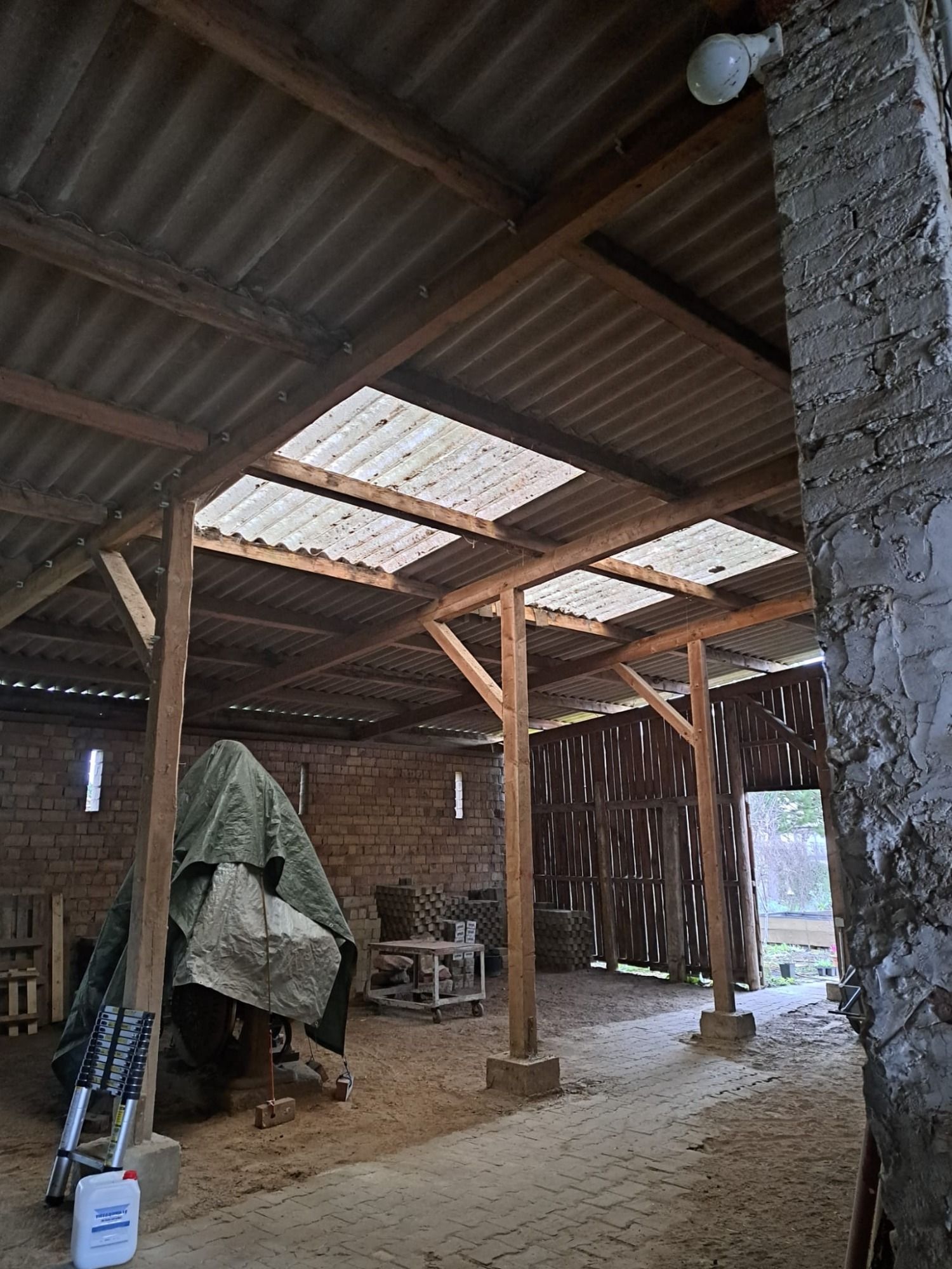Das Scheunendach bestehend aus Betonziegeln wurde entfernt, das Scheunengebälk wurde zurück gebaut, ein Großteil vom Gebälk Holz blieb Vorort.