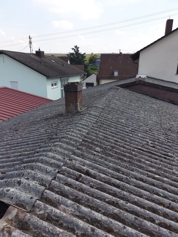 Hier mussten wir eine komplette Abschottung aus Dachdeckergewebeplanen und Holzkonstruktion ringsherum, um das EFH zu bauen, da wir die Asbestplatten brechen mussten und die Asbestfasern nicht ins freie ausströmen konnten, war mit großem Aufwand verbunden, haben es aber gut gemeistert.