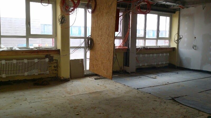 Abbruch verschiedener Mauerwände mit elektrischen div. Abbruchhämmer, Demontage von GFK-Decken (Gipskarton), Abbruch von Betontreppenstufen und Schneide- und Stemmarbeiten im Estrichboden zur Vorbereitung für Trennwände einbauen.