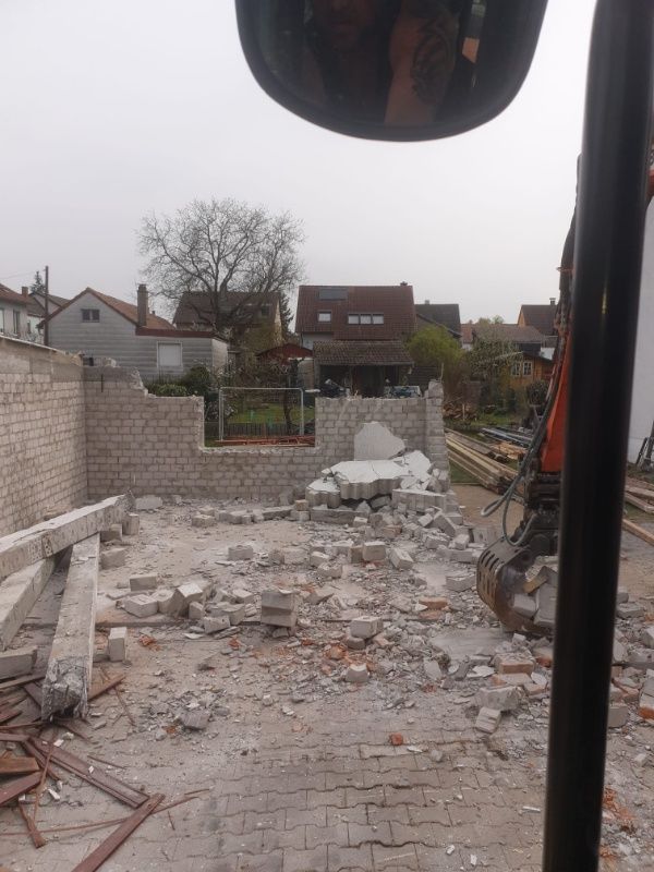 Abbruch der Doppelgarage mit Eisen animierter Betondecke und Betonbodenplatte, sowie überdimensionale Fundamente bis 1,10 m Bodenkante, Abbruch des Anbaus mit Bodenplatte und Fundamente, diese Arbeiten wurden mit einem 8,5 t Gummikettenbagger und den dazugehörigen Anbaugeräte, wie Abbruch-Sortiergreifer, Hydraulischer Abbruchhammer und Baggerschaufel.