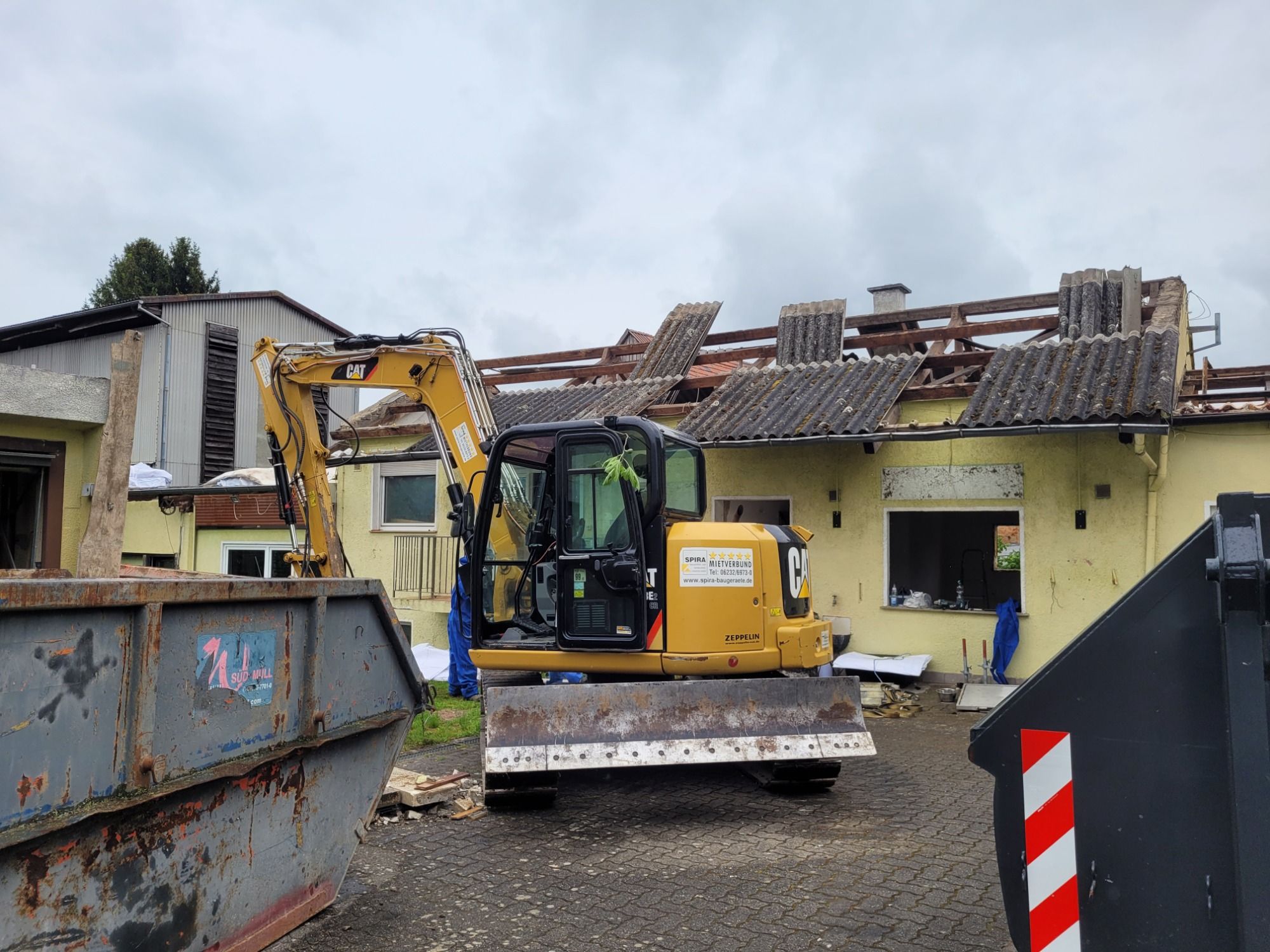 Über 300 qm Asbestwelleternitplatten vom Dach nach TRGS519 -ASI demontiert in in Container (Abroller geladen, danach wurde ein kleiner Anbau mit Betondecke und Bodenplatte mittels 8 Tonnen Gummikettenbagger entfernt unter schwierigen engen Bedingungen, mal wieder eine herausforderung für den Baggerfahrer, der die Sitation gut einschätzen konnte und ohne Schäden zu Ende gebracht hat.